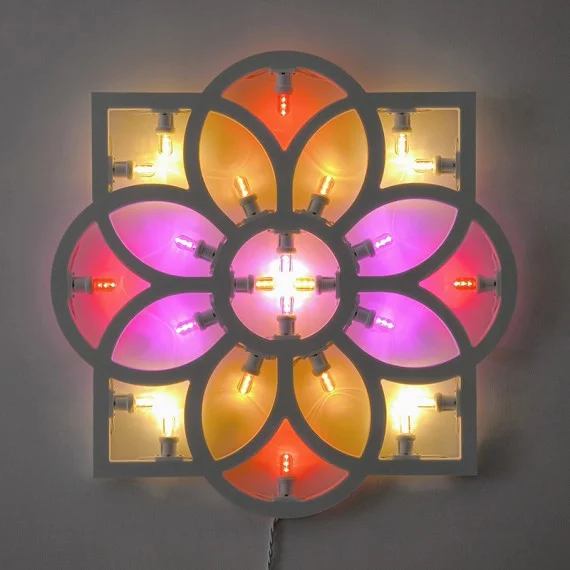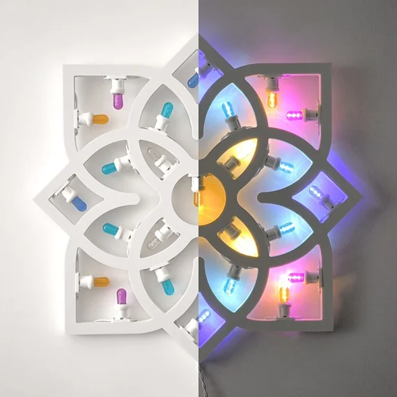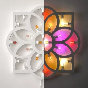 Glicine è una luminaria murale in forex 60×60 cm: fiore traforato bianco con lampadine colorate. Leggera, pop e scenografica,...